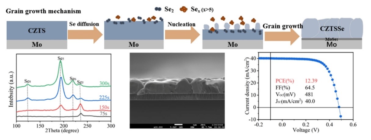 Cu2ZnSn(S,Se)4 (CZTSSe)太阳能电池不理想的晶体质量一直是制约其器件性能的主要因素,尽管多种硒化策略已被开发用于改善吸收层晶体质量,CZTSSe吸收层的多层结晶现象仍普遍存在。本次发表在Solar RRL上的工作首次通过调控硒的蒸发面积,研究了影响吸收层不同晶体生长模式的机制。结果表明,合适的Se蒸发面积不仅可以优化Se蒸汽达到饱和的时间,促进前驱体薄膜与活性Se2之间的快速反应结晶,还可以抑制CZTSSe/Mo界面的成核,使CZTSSe薄膜呈现出完美的自上向下的晶粒生长模式。通过系统优化,获得了具有单层贯穿晶的CZTSSe薄膜,相应器件的效率达到了12.39%。本研究阐明了CZTSSe薄膜多层结晶的内在机制,并为提高CZTSSe薄膜结晶性提供了一种新的硒化策略。