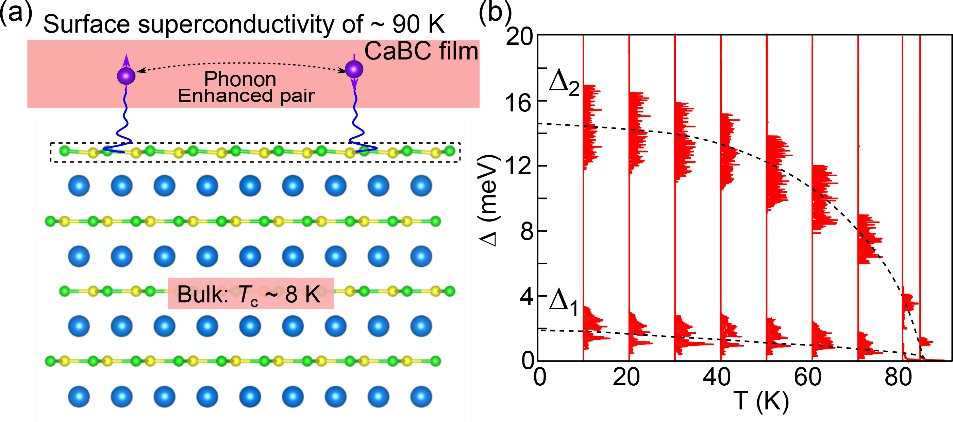 图2:(a)表面超导增强示意图(b)CaBC薄膜的超导能隙D随温度变化,显示Tc达到了近90 K。