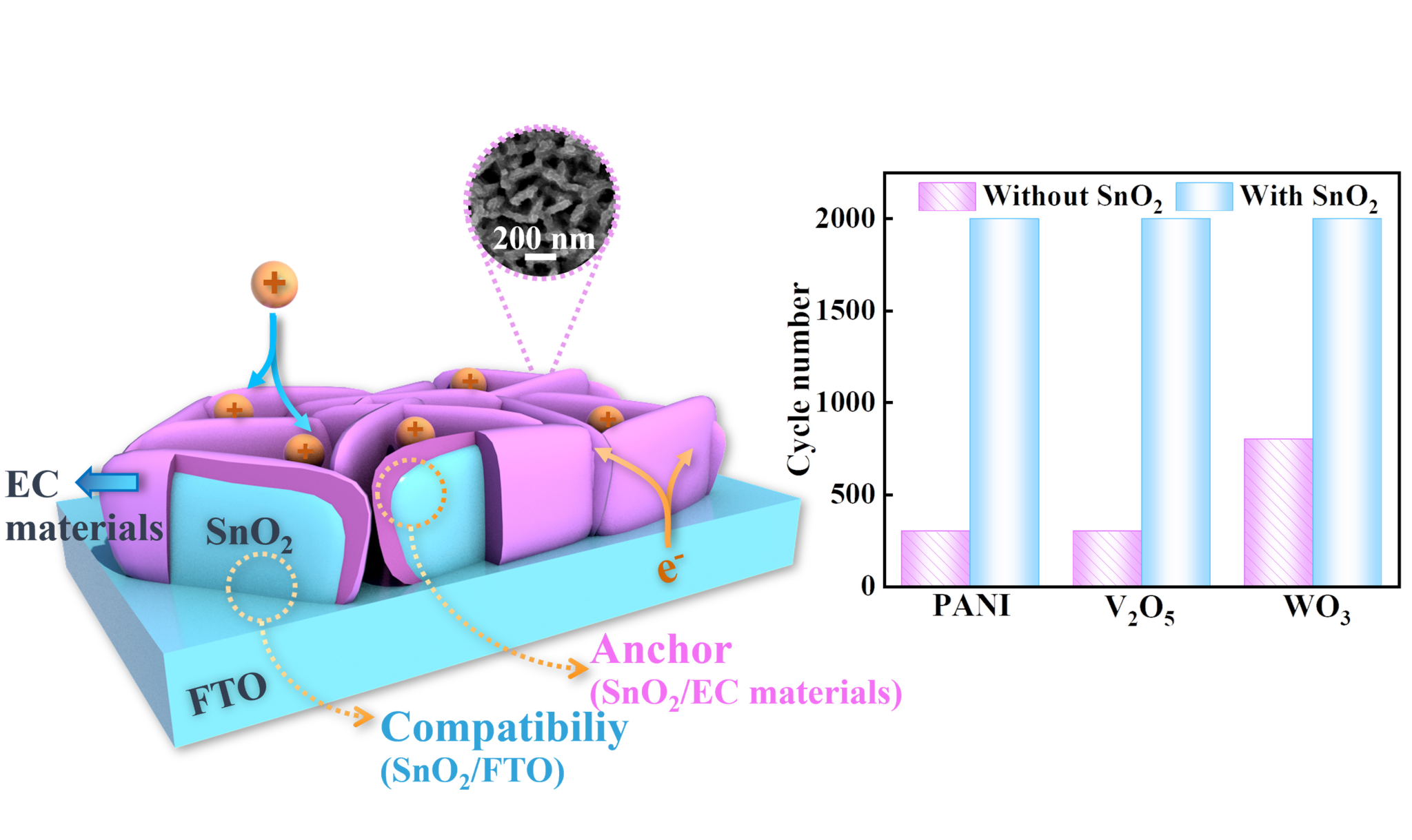 电致变色器件在智能窗、低能耗显示、防炫目后视镜、红外隐身等领域有着广泛的应用前景。然而,由于目前电致变色薄膜缺乏合理孔道结构及变色材料与透明导电电极(FTO)之间兼容性较差,导致器件存在光学调制范围小、循环稳定性差等问题,严重制约了其发展。本研究中,我们提出了一种构建高性能电致变色薄膜与器件的普适性策略,通过合理设计电极的纳米结构,精确调控离子/电子传输路径,提升了变色材料与透明电极之间界面兼容性,成功地构建了高质量多孔电致变色复合薄膜。研究结果显示,此策略对于典型金属氧化物或导电聚合物的电致变色性能(如光学调制范围、循环稳定性、着色效率等)均有大幅提升。在上述工作基础上,我们进一步构筑了具有优异循环稳定性及较大光学调制范围的互补型多色电致变色原型器件。该研究为高性能电致变色器件的构建提供了一种普适性策略。