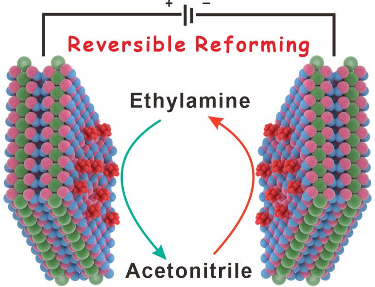 针对这一问题,代磊教授及其合作团队通过原位再造策略合成超薄二维Pd-Ni(OH)2纳米片催化剂,Pd物种由Ni(OH)2表面的HCOO-物种还原,在此欠还原剂的合成环境中,Pd纳米颗粒无法过度生长并维持在低晶状态,Ni(OH)2则作为原位生长载体,牢牢锚定住超小的Pd纳米颗粒,最终形成Pd-Ni(OH)2异质结二维材料,研究团队同样深入探讨了Pd-Ni(OH)2异质结催化剂在乙胺和乙腈的可逆电化学重整反应中的催化性能。在乙腈还原过程中,Pd作为反应中心,而Ni(OH)2物种促进水的解离并提供所需的质子氢。与此同时,Pd-Ni(OH)2异质结材料中丰富Ni(II)缺陷位点则作为乙胺氧化制乙腈的脱氢活性中心。团队同时定义了可逆电重整过程。可逆电重整过程的发展将为探索新的可持续能源转换系统和多功能催化剂设计提供重要的启示。