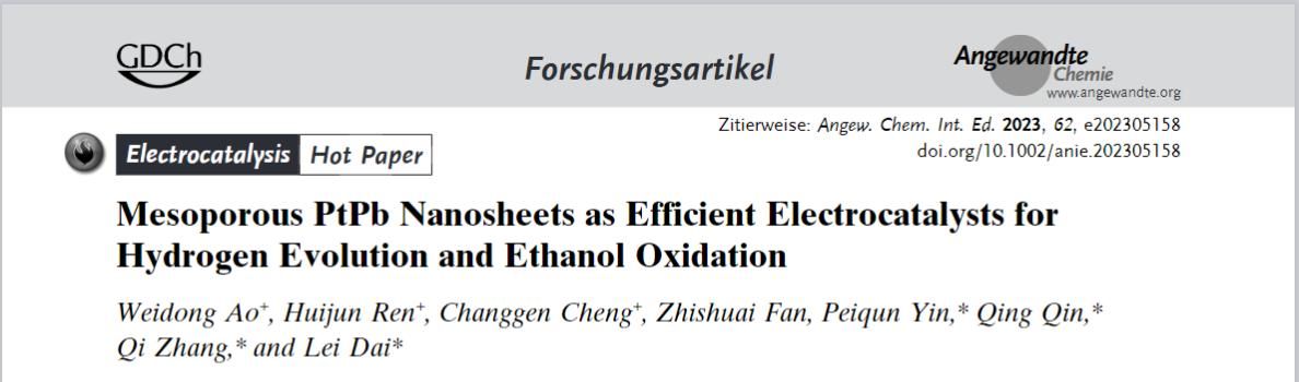 针对这一问题,代磊教授及其合作团队采用乙二胺一锅水热法,成功制备了在析氢和乙醇氧化中都表现出优异活性的介孔PtPb纳米片。PtPb纳米片具有Pt富集结构,孔道结构遍布整个纳米片,使得内部原子可以有效地参与到电催化过程中。介孔PtPb纳米片与合成过程中Pb物种的解离密切相关。此介孔PtPb纳米片能够在碱性条件下获得10 mA/cm2的电流密度仅需21 mV的过电势。在低浓度乙醇电氧化过程中,介孔PtPb纳米片能够获得的最大质量活性为1233 mA/mg,比商业Pt/C高出5.66倍。 此项工作成功发表在Angew. Chem. Int. Ed.上,并被Angew编辑部选为Hot Papers。这项工作为合理设计高效多功能介孔二维电催化剂以及开发新型绿氢生产体系开辟了新的机遇。