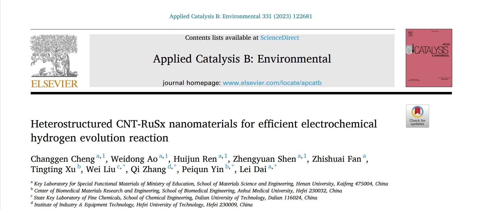 为第一完成单位,第一作者为代磊课题组已毕业研究生程长根。(Applied Catalysis B: Environmental, 2023, 331, 122681)