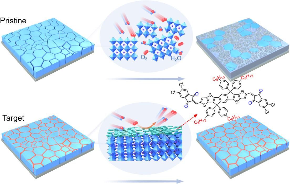 卤化锡钙钛矿太阳能电池(PSCs)具有环境安全、光电性能优异等优点。然而,其较差的空气稳定性尚未得到良好的改善。在这项工作中,疏水的n型有机分子(IO-4Cl)是一种多功能层,可以有效的阻隔水氧进入卤化锡钙钛矿膜并增强电子传输。在相对较高的湿度(60% ~ 80%)下,测试了含IO-4Cl的卤化锡钙钛矿膜的良好空气稳定性。此外,原位掠射广角x射线散射发现,IO-4Cl可以减缓钙钛矿薄膜的结晶动力学。我们的工作提供了对卤化锡钙钛矿薄膜增强空气稳定性的见解。