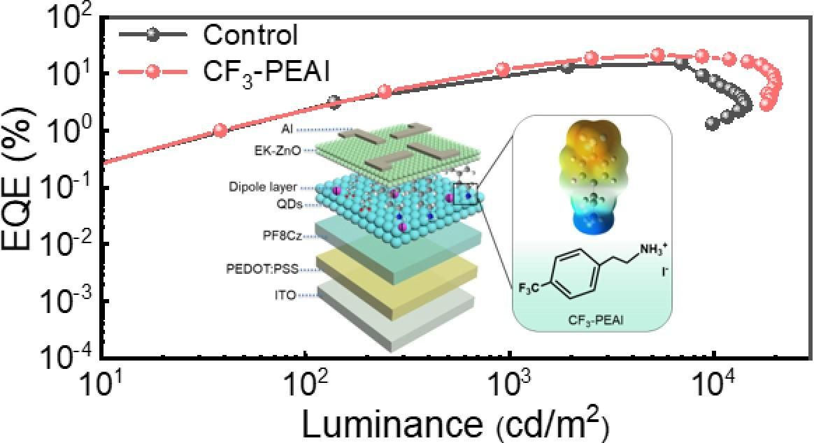 图1. CF3-PEAI-QD基QLED器件EQE-L特性;器件结构和CF3-PEAI分子静电势分布。