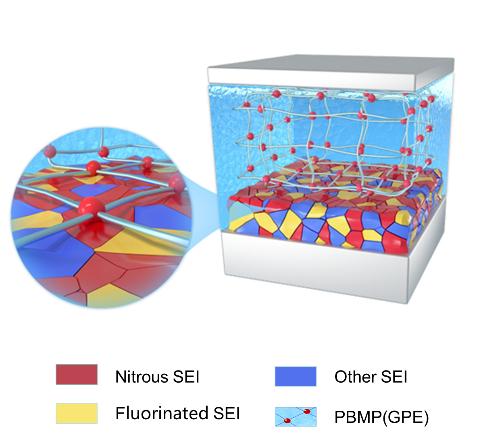图1. PBMP基GPE与钠金属电极反应形成富氮SEI示意图。
