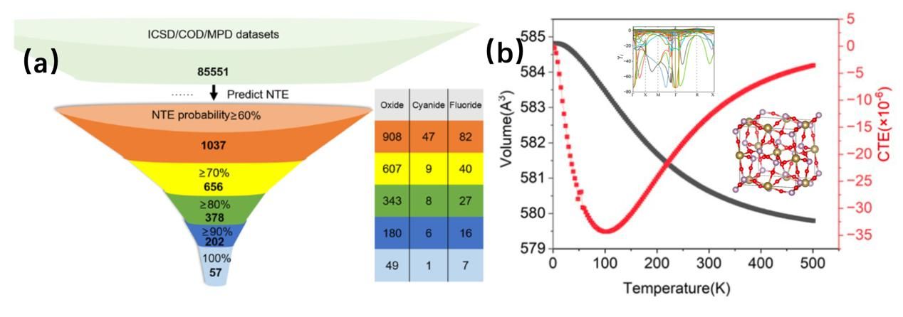 图2(a)利用机器学习预测数据库中存在的负膨胀材料数目和其概率。(b)利用第一性原理计算对机器学习预测结果的验证, TaP2O7的计算的结果和预测结果完全符合。