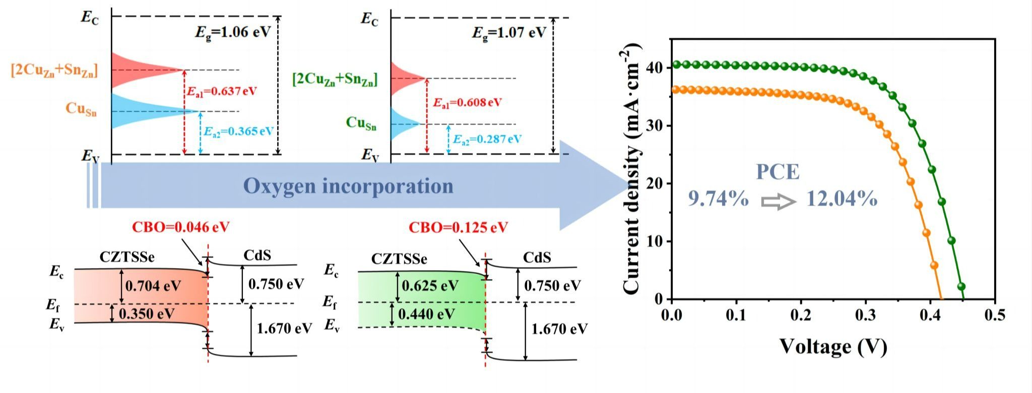 CZTSSe薄膜太阳能电池光伏性能受到严重的界面载流子复合限制,远低于其理论水平。前界面能带排列以及吸收层表面缺陷较多是引起载流子复合的主要原因。我们通过空气退火的方式在CZTSSe吸收层中引入了氧掺杂来优化表面光电性能并减少缺陷。在最优的氧掺杂条件下,前界面载流子分离和收集性能得到提升,氧的结合加剧了吸收层能带弯曲,拓宽了耗尽区宽度,抑制了吸收层缺陷,并且使吸收层晶界和晶内电势差变大,这些都为载流子传输提供了更有利的途径。经过氧掺杂,CZTSSe的效率提升至12.04%,其中开路电压得到了明显的提升。本工作为界面调控提供了一个新的思路。(第一作者:邓世成;通讯作者:麻豆a片