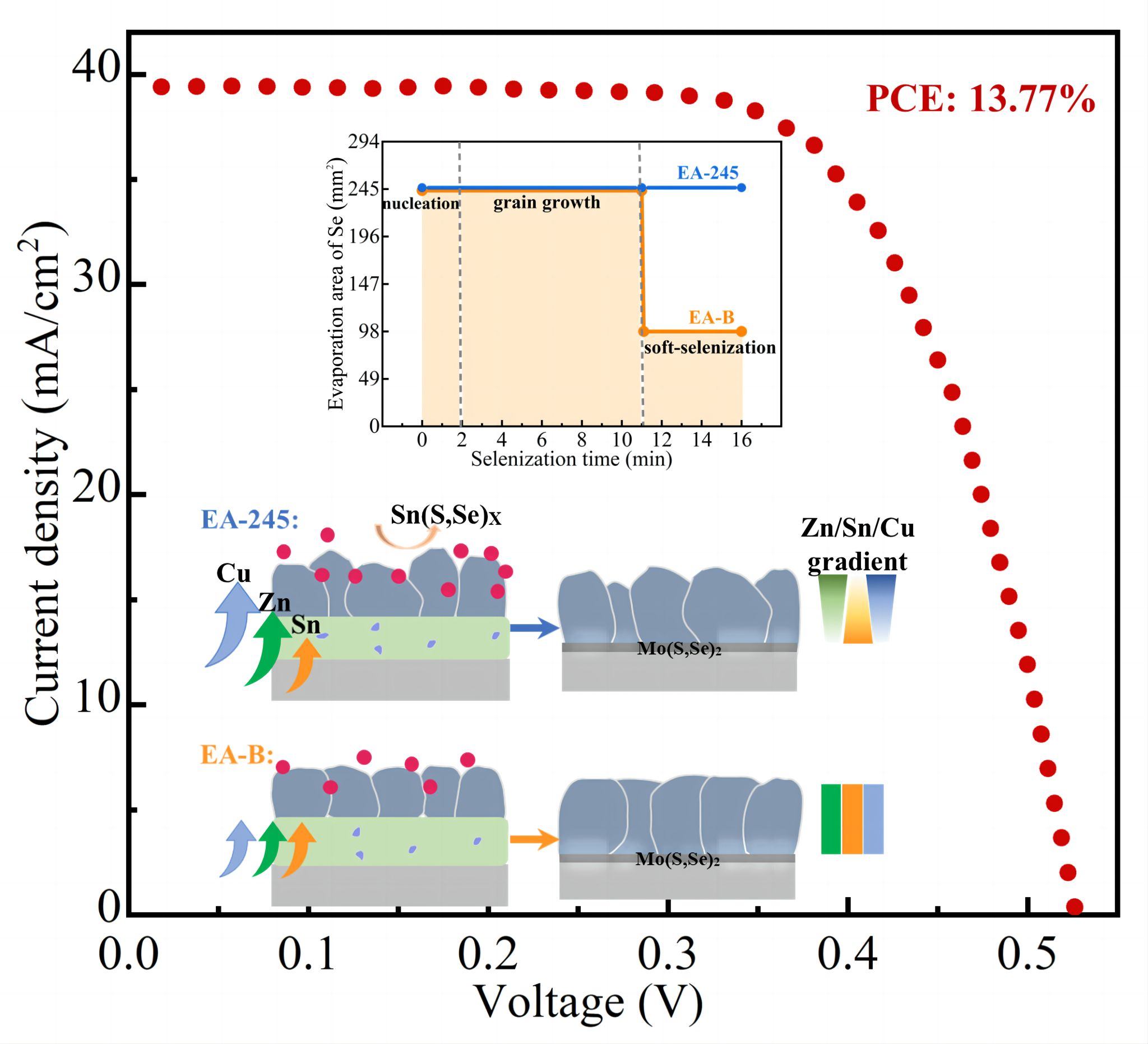 此外,体相内大量的深能级缺陷同样限制着CZTSSe光伏器件开路电压和转换效率的进一步提高。制备具有低缺陷浓度的高质量吸收层对于改善CZTSSe光伏性能至关重要。然而,由于硒化反应的不可控性和薄膜生长硒化环境的复杂性,高质量吸收层的制备仍面临严重的挑战。我们创新性的提出了一种硒化环境的分段调控策略,即在硒化初始阶段提供较大的硒蒸发面积促进薄膜的快速相变反应及晶粒生长,在硒化后期提供较小的硒蒸发面积创造一个软硒化环境,抑制Sn元素损失并促进元素均匀化,从而缓解元素失衡引起的Sn相关深能级缺陷的增殖。结晶性和缺陷的协同优化,抑制了严重的非辐射复合并增强了载流子的传输和收集,从而改善了电池的开路电压,将CZTSSe的效率提升至13.77%。(第一作者:简玥;通讯作者:麻豆a片
