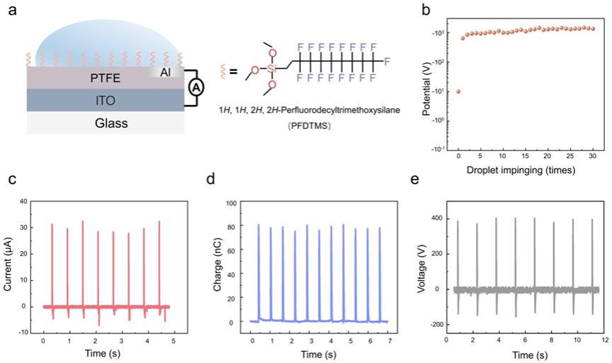 实现具有快速起电过程的高输出水滴摩擦电纳米发电机仍然面临挑战。我们提出了一种通过策略性表面分子修饰的方法,以提高水滴摩擦电纳米发电机的输出特性。通过对摩擦层表面分子进行修饰,我们成功降低了电子从水分子转移到聚合物分子的能垒,加速了电子转移过程,从而提高了起电速度。仅通过5滴水的撞击和接触,摩擦层的表面电势就可以达到其最终饱和表面电势的85%。此外,该方法有效增加了固-液接触位点,提升了摩擦层的饱和表面电势。最终制备的功能化水滴摩擦电纳米发电机展现出优异的输出特性。该研究成果以Elevating Outputs of Droplet Triboelectric Nanogenerator through Strategic Surface Molecular Engineering为题在国际学术期刊ACS Energy Letters上发表。麻豆a片