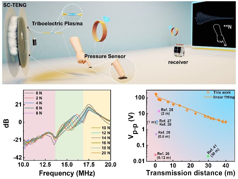 在本工作中,通过能量采集、传感和通信模块之间的高效耦合,简化了SP-WSS的结构,降低了实时传感的功耗。首先,通过电容式压力传感器和电感线圈组成的LC电路将传感和通信耦合,使传感-通信周期的能量降低到9 μJ,在1 Hz的工作频率下,SP-WSS可以每27 ms发送一次信号。然后,传感LC电路由TENG直接触发,使用摩擦电等离子体作为开关。由于摩擦电等离子体的超快开关特性(13.2 ns),通信频率可达72.55 MHz,实现实时压力传感。通过摩擦电等离子体降低TENG的等效阻抗,实现与LC电路的阻抗匹配,使能量转换效率达到56%,在峰峰电压(Vp-p)为3 V的情况下,使信号传输距离达到40 m。这些结果是SP-WSS的新记录。最后,将光电探测器集成到电路中,展示了系统对光强和压力的协同传感能力。本文提出了一种可行的实时SP-WSS方案,将极大地促进SP-WSS的实际应用。