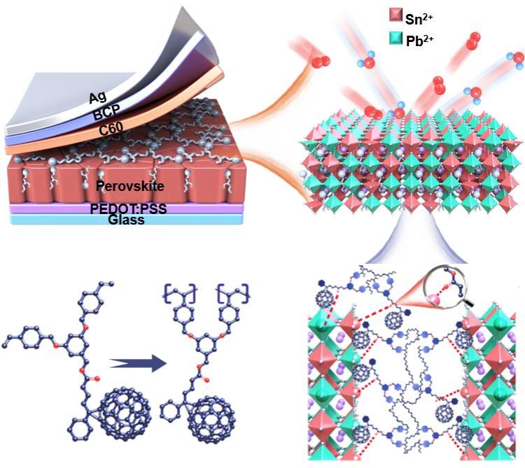混合锡铅钙钛矿具有窄带隙、可组成全钙钛矿叠层太阳能电池等特性。然而,Sn2+的氧化和快速结晶以及界面陷阱阻碍了其进一步发展。功能化热交联富勒烯分子在加快钙钛矿太阳能电池发展表现出巨大潜力。因此,合理利用功能化热交联富勒烯分子对于抑制缺陷,提高薄膜结晶性至关重要。