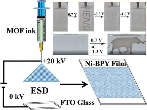 金属-有机框架(Metal-Organic Frameworks,MOFs)材料由于其本征导电性差的原因,使得其在电化学领域的应用受限。针对上述原因,电致变色课题组提出了混合配体策略构筑paddle-wheel结构金属-有机框架的策略。利用离域吡啶配体增加与金属节点的轨道重叠程度进而改善材料的导电性能,并进一步利用静电喷涂的方式将其制备成薄膜。获得的薄膜实现了MOFs材料在水系KOH体系中透明到棕黑色的电致变色性能,并且基于多孔策略实现了其褪色过程的分步调控特性。该成果以Transparent-to-Brown-Black Patterned Electrochromic Metal−Organic Frameworks为题发表在期刊ACS Applied Materials&Interfaces上。麻豆a片