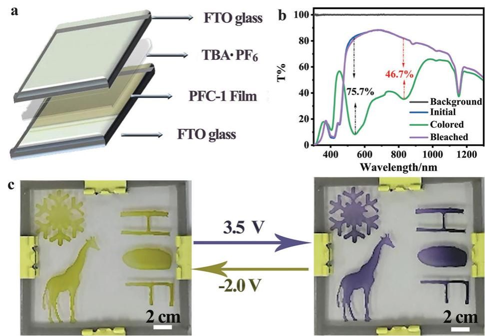 图3.氢键有机框架基电致变色器件结构示意图及其变色性能和光学照片。