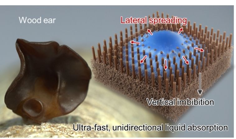 图1. 液滴在木耳柔毛面横向铺展、纵向渗透,实现超快、定向液体吸收。