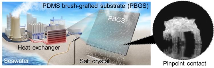 图1. 聚硅氧烷分子刷用于盐水喷雾冷却,盐晶底部形成柱状结构,盐晶可自基底表面脱附。
