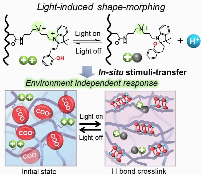 图1.原位刺激转移机制使聚丙烯酸水凝胶实现高性能刺激响应和多环境形状变形功能。