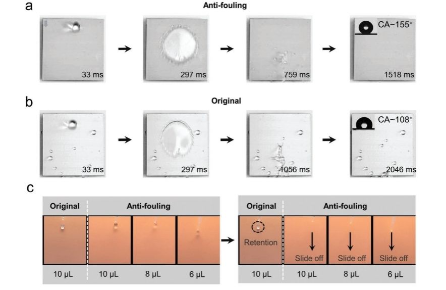 针对这一问题,研究团队创新性地提出了一种抗污染液滴摩擦纳米发电机,构建具有防污特性的微纳结构表面,接触角达155°,滑动角仅5.3°。水滴可以在器件表面快速滑落,减少残留物沉积,显著提升了器件的抗污染性能。经过10,000次液滴冲击后,器件仍保持93%的发电性能,而参照样器件性能下降53%。