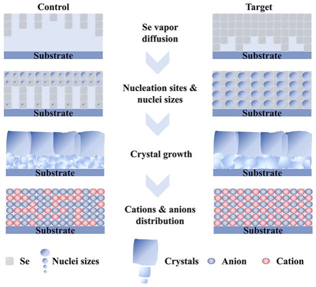 对照组和目标样品从前驱体到CZTSSe吸收层的可能形核、结晶和阳离子/阴离子分布过程的示意图。蓝色和红色椭圆圈分别对应阳离子和阴离子。