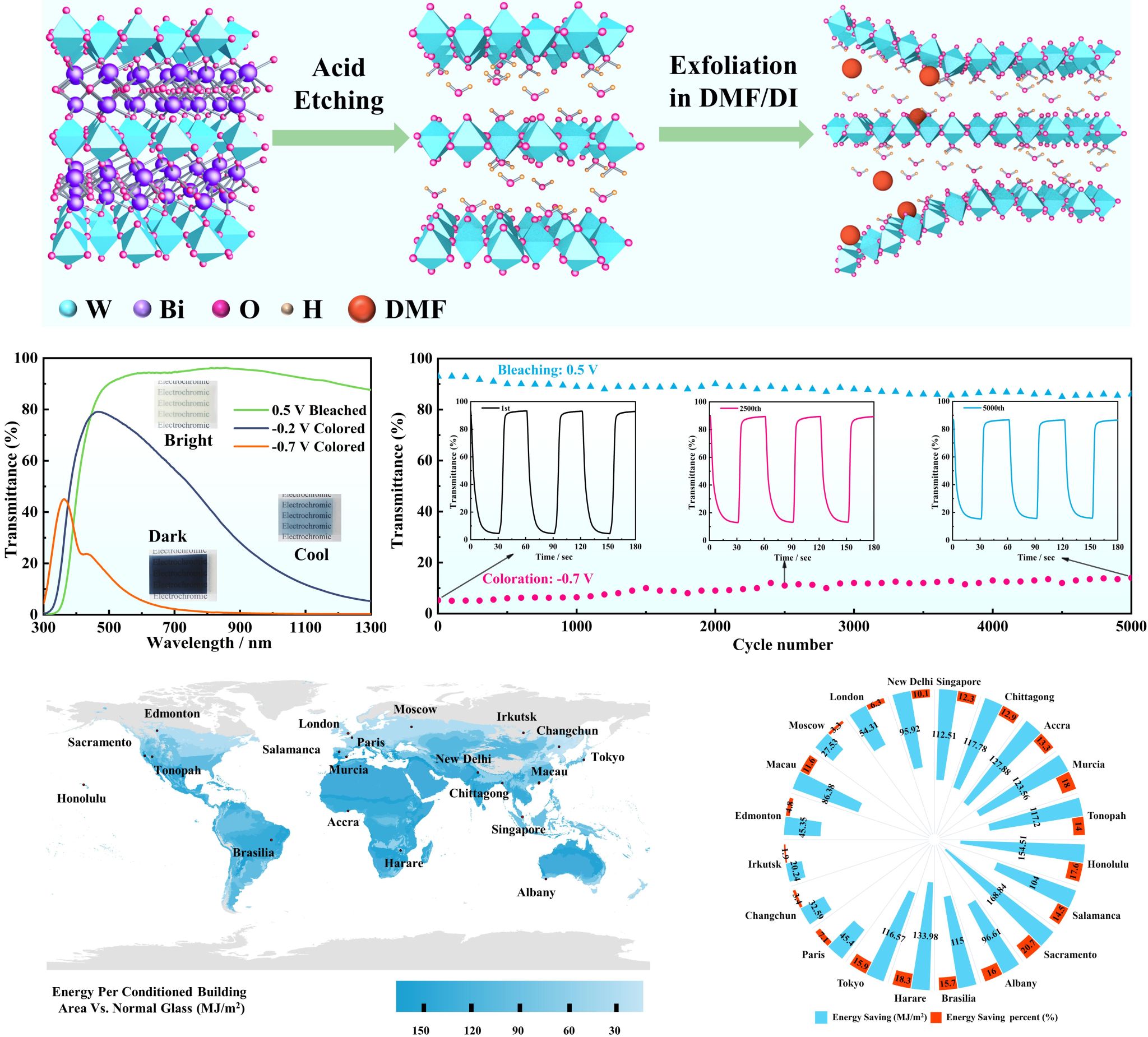 教授团队提出一种自上而下制备WO3超薄纳米片的策略,通过离子蚀刻Aurivillius相Bi2WO6和液相剥离技术高效制备了厚度约4.5 nm的超薄WO3·H2O纳米片。超薄纳米片结构大大增加了WO3·H2O薄膜比表面积及活性位点,有效避免离子传输受到层间静电相互作用的限制。实验结果表明,超薄WO3·H2O纳米片薄膜在可见-近红外双波段上分别实现了90%和90.5%的超大调制,可实现10 s以内的快速切换,并呈现了5000次的优异循环稳定性。系列原位测试表明,超薄纳米片的可逆价态变化和微小的结构应变确保了其稳定及优异的电致变色性能。此外,基于WO3·H2O纳米片薄膜组装的大尺寸自供电智能窗户(100 cm2),在房屋模型中实现了12°C的温度调控。仿真结果表明,安装该智能窗的建筑可降低能耗168.8 MJ m−2,比传统玻璃窗户节能效率高20.7%,显示出其良好的光热调控能力。这种自上而下制备超薄纳米片的策略为探索下一代高性能电致变色材料和器件提供了新的思路。