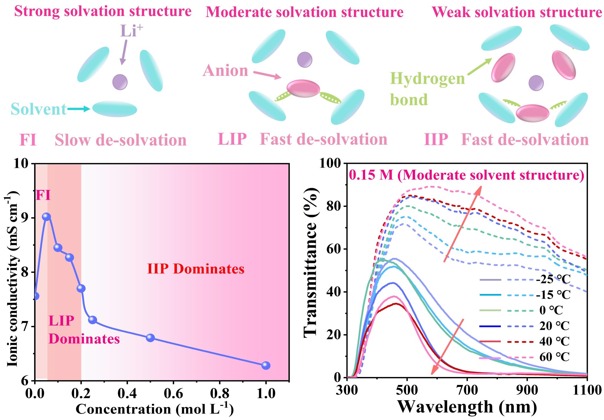 教授团队通过调控溶剂-阳离子与阴离子的相互作用,调节溶剂化结构以构建合适的离子配位环境,开发了一种基于深共晶溶剂(DES)的电致变色电解质,其在宽温度范围(-25至60°C)内展现出较好的热稳定性、低凝固点和较高的离子导电性。该DES基电解质良好的物理电化学特性使WO3·xH2O薄膜在-25至60℃宽温度范围内展现出较佳的电致变色性能:其在-25℃时光学调制率达74%,60℃时达82%(633 nm波长下),响应速度分别为tc=6.3 s,tb=7.9 s,并具有1500次循环稳定性。更重要的是,基于DES电解质组装的电致变色器件可在-25至60℃范围内稳定工作,这得益于电解质良好的抗冻性和耐热性。基于DES电解质的合理设计为拓展电致变色器件工作温度范围提供了有效策略,将推动其更广泛的应用前景。