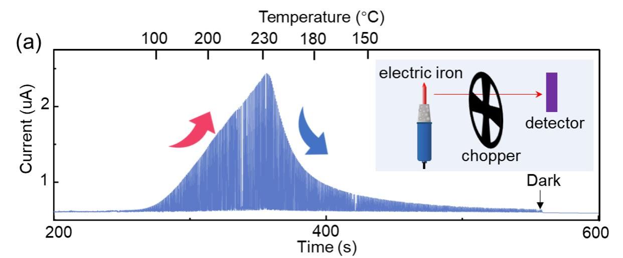 研究团队还展示了该PbSe量子点红外探测器可以精准实时的识别100 ℃物体黑体辐射发出的红外信号(图3),这是因为大尺寸的PbSe量子点红外探测器在2500 nm的光谱位置仍有极其灵敏的探测能力,且响应速度达50 us,100 ℃物体黑体辐射在2500 nm处已有相当的辐射能量。