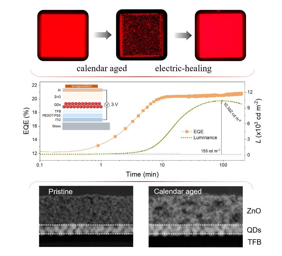 量子点发光二极管(QD-LED)凭借其高亮度、优异的光学品质和长寿命,正成为下一代高动态显示与增强现实/虚拟现实(AR/VR)系统的核心技术。然而,大多数QD-LED在储存过程中会出现意外的性能衰退,即所谓的“日历老化”现象——器件电致发光性能显著下降,有源发射区产生密集暗斑,严重影响其稳定性和可靠性。值得注意的是,本研究首次发现并报道了老化器件在电场作用下的“自修复”行为:发光亮度与效率逐步恢复,暗斑区域逐渐消失。但这一过程的微观机制此前尚不清楚。