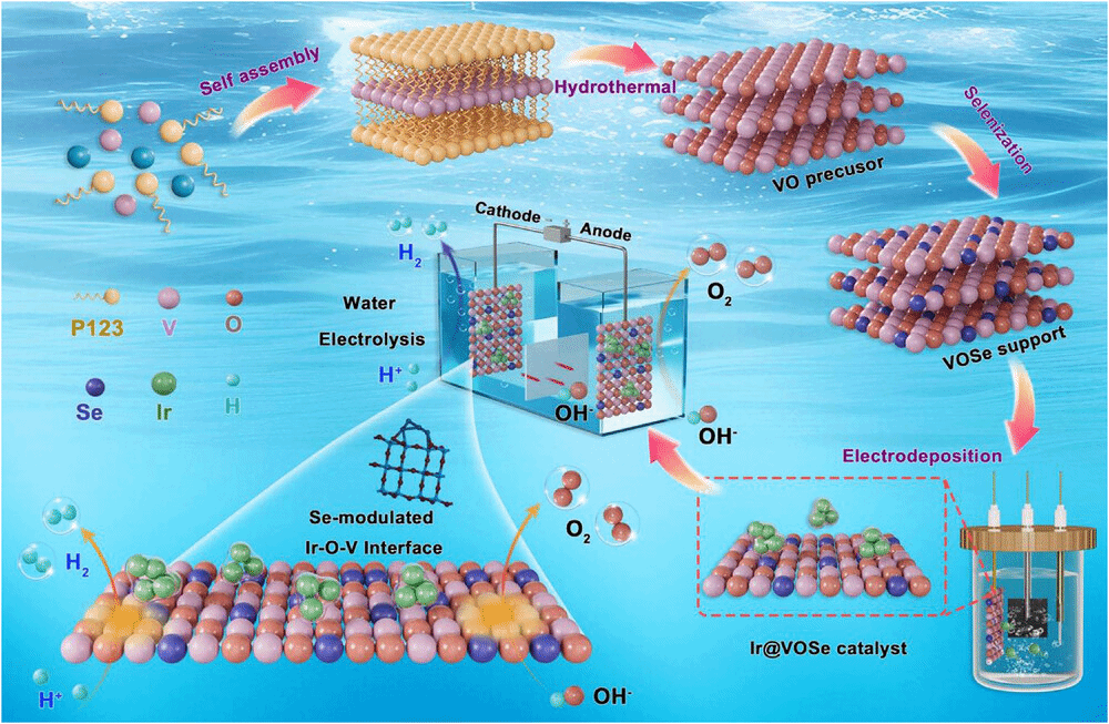 课题组在国际知名期刊《Advanced Functional Materials》上,发表题为“Selenium-Modulated Ir–O–V Interface for Adaptive Surface Reconstruction Toward Favorable Water Electrolysis”的研究性论文。