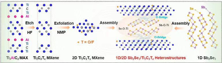 在本研究中,通过引入界面氧桥结构,成功构建了Sb2Se3/Ti3C2Tₓ MXene异质结,旨在提升其赝电容型Na⁺存储性能。实验与理论计算结果表明,将一维Sb₂Se₃与氧端基修饰的二维MXene复合后,在界面处(Sb/Se–O–Ti)诱导出强烈的电子耦合作用,显著降低了Na⁺沿择优表面路径的扩散能垒,从而有效稳定了材料的钠化/去钠化循环过程,增强了电极的循环稳定性与结构耐久性。此外,本研究进一步揭示了氧桥键对界面电子转移及Na⁺吸附行为的显著调控作用,凸显了其在提升赝电容贡献与离子存储性能方面的关键角色。该工作不仅为设计高稳定性钠离子电池电极材料提供了新视角,也为缓解二维材料在电化学环境中的氧化问题提供了一种潜在的有效策略。