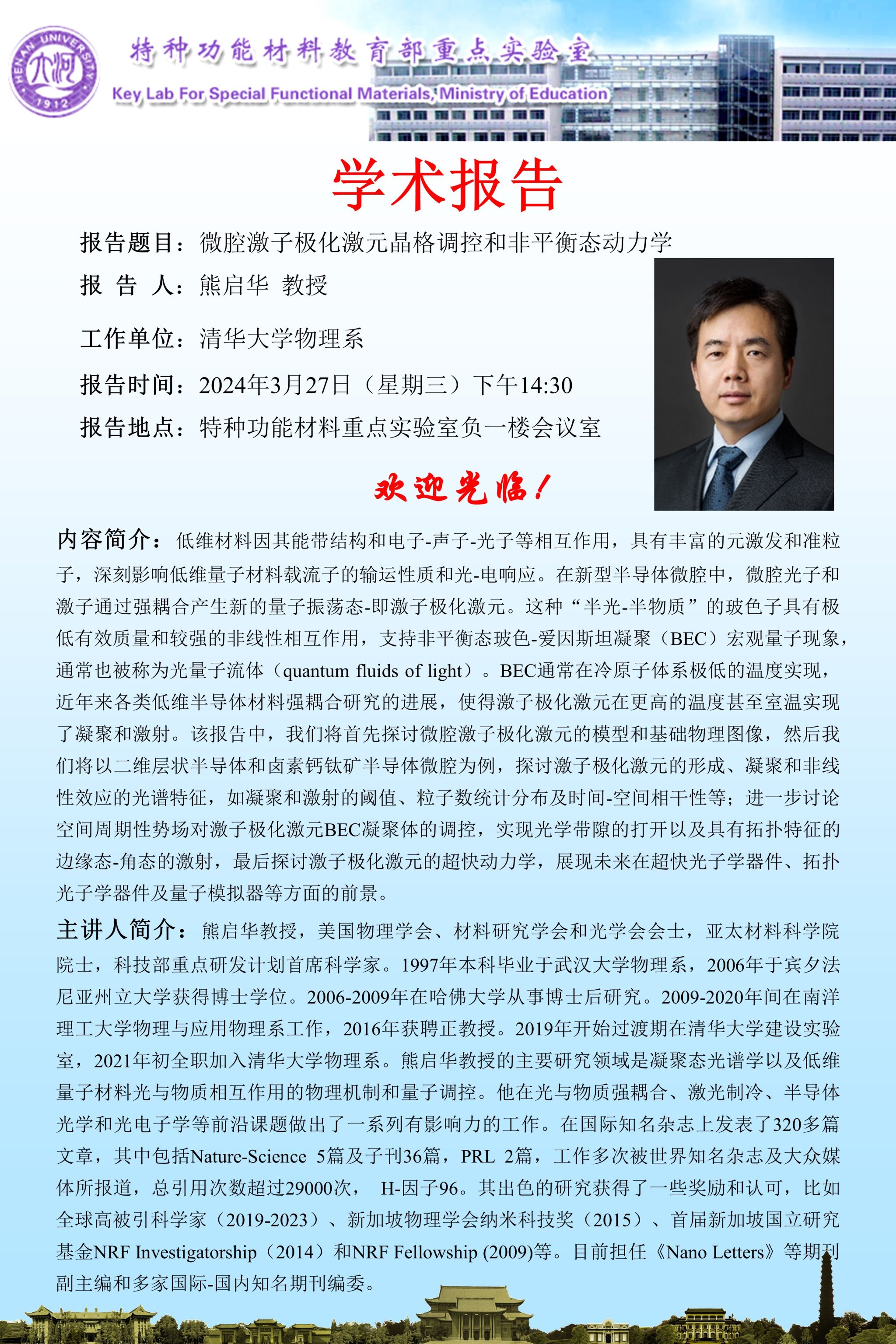 熊启华:微腔激子极化激元晶格调控和非平衡态动力学(时间:3.27)