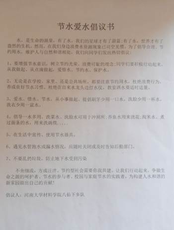 2019级纳米材料与技术专业7位同学组成的实践团在各自家乡宣传节水爱水暑期实践活动,本次活动分为情况调查和宣传两部分进行。