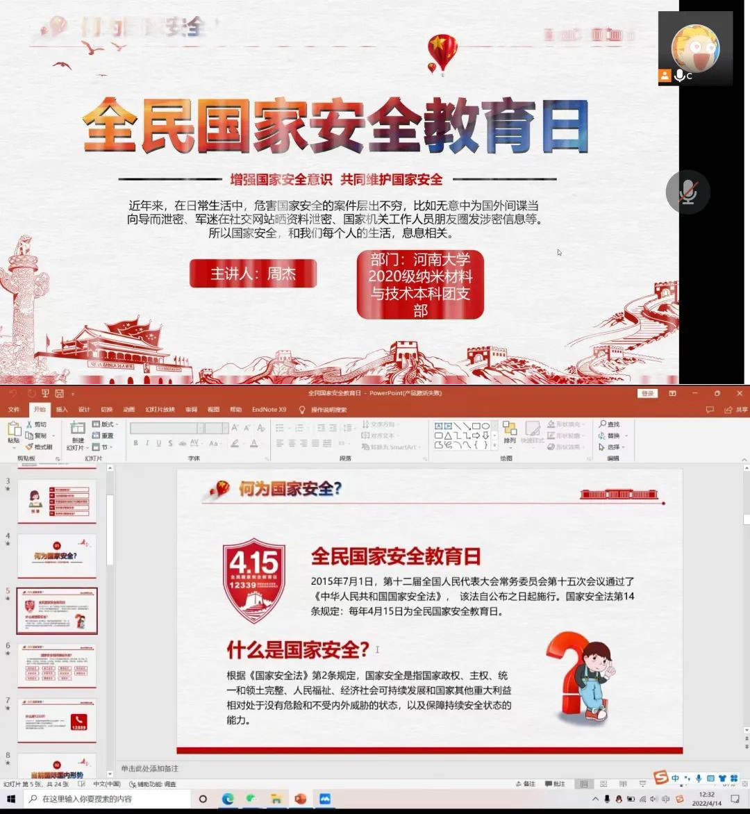 4月15日是第七个全民国家安全教育日,为推动国家安全宣传教育工作深入开展,增强全民安全意识,麻豆a片 紧扣活动主题——树牢总体国家安全观,感悟新时代国家安全成就,为迎接党的二十大胜利召开营造良好氛围,根据疫情防控要求,于4月14日下午,以线上宣讲的形式开展了国家安全教育日宣传教育主题团日活动。全体本科团支部参加此次宣讲会。
